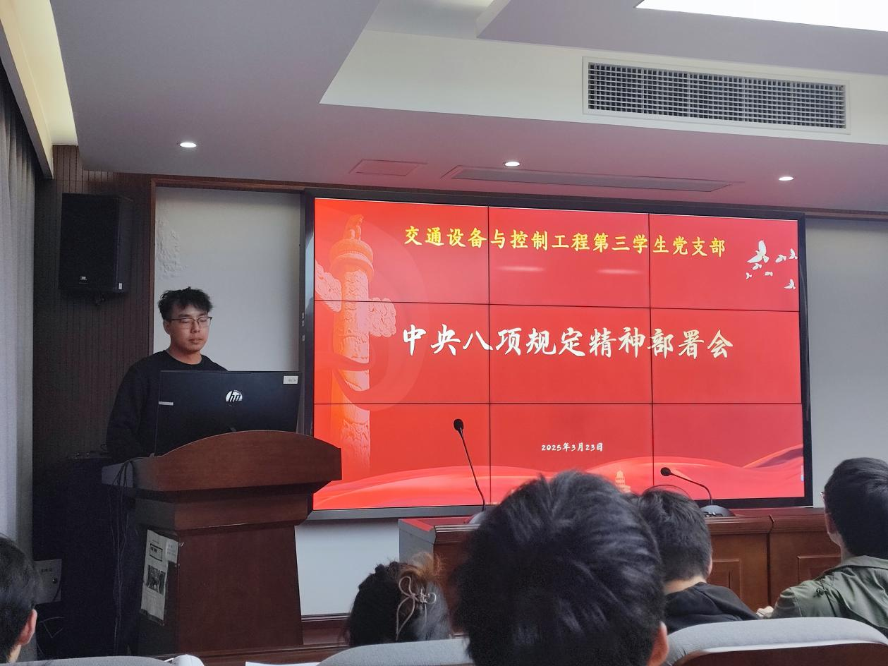 3月23日晚,交通设备与控制工程第三学生党支部在交通楼425召开了中央八项规定精神学习教育部署会。会议由官群雄同志主持,支部全体成员参加。