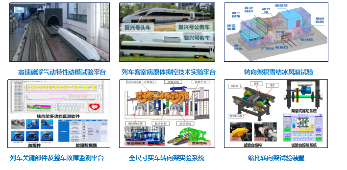 实验室拥有世界最先进的时速600公里级高速列车气动特性动模试验平台、国内唯一的实际列车客室环境试验平台群、国内领先的高速列车旋转机械故障诊断与结构健康监测试验装置,团队成员承担了高速列车研究中心几乎所有的高速磁浮系统空气动力学方面的科研项目,获批研究时速350-400公里更高速铁路缓冲结构设计标准,全面参与了我国CR450高速动车组所有线路的换装实车试验,主持负责时速600公里高速磁浮列车气动外形参数化、空气动力学关键技术研究,并在国际上首次完成时速600公里级高速磁浮列车明线交会和过隧道气动特性评估动模试验验证;全面参与了动车组、城轨车辆旋转机械与结构等关键部件的故障诊断与智能运维方法研究,建成了适用于各型轨道车辆的先进传感器、数据采集硬件平台和智能算法软件平台,并完成装车集成应用。