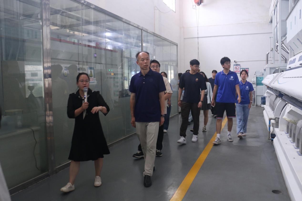 实践团参观了稻谷加工核心区域,从原料清理、砻谷脱壳到碾米抛光,全程采用自动化设备。检测中心配备精密仪器,对重金属、农药残留等指标进行严格检测,确保大米品质安全。企业负责人介绍,公司通过"公司+基地+合作社+农户"模式,实现了“从田间到餐桌”的稻米全产业链生产,并依托互联网平台,实现了基地种植、车间生产、仓储管理、网络销售等稻米生产管理的系统化、信息化、数字化。