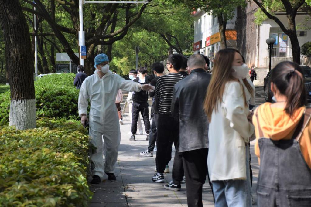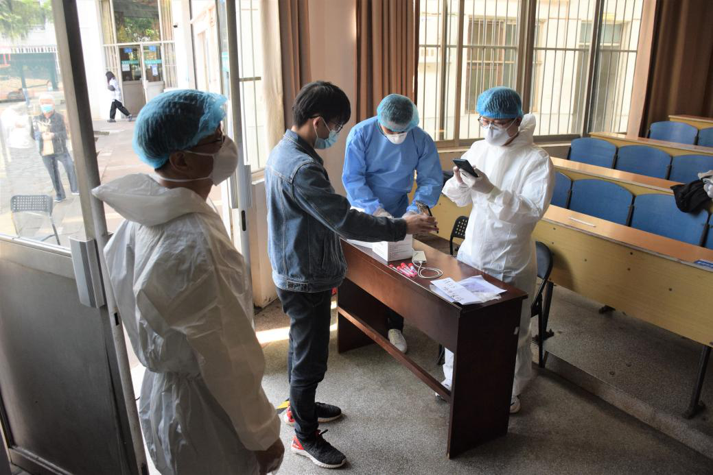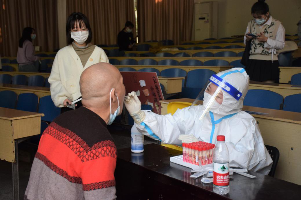 已有30余名教职工参加了防疫志愿服务工作。每天在志愿者工作群里,仍有源源不断的教职工主动请缨。征集志愿者的通知一出,即使是在深夜11点,10分钟队伍就能集结完毕,真正的“一岗难求”。他们当中,既有刚刚参加工作的青年教师,也有即将退休的老教授,在抗“疫”一线,他们都是勇毅的战士。从“三尺讲台”走上抗“疫”战场,他们身穿白色防护服、戴着厚厚的口罩,参加核酸检测筛查点位值守,一站就是6个小时。“很高兴来参加志愿者工作,比在实验室写论文更有成就感”,新进青年教师王家斌自豪地说。实验中心陈峰老师已经从上午的志愿岗下班了,下午看到检测时间延长又跑过来帮忙,但下午班的老师们谁都不肯离开岗位,一个劲地说:“再给我们配一些试剂”。这样的动人瞬间不胜枚举!教职工志愿者在抗疫一线用实际行动诠释人民教师的责任和担当,为全体师生筑起一道疫情防控的严密防线。