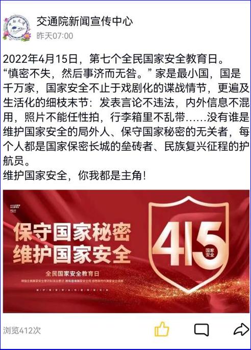 新闻宣传中心牵头,明确4月15日是第七个全民国家安全教育日,聚焦“树牢总体国家安全教育观,感悟新时代国家安全成就,为迎接党的二十大胜利召开营造良好氛围”的教育主题,普及相关知识,以图文结合的形式在全球最大博彩平台
