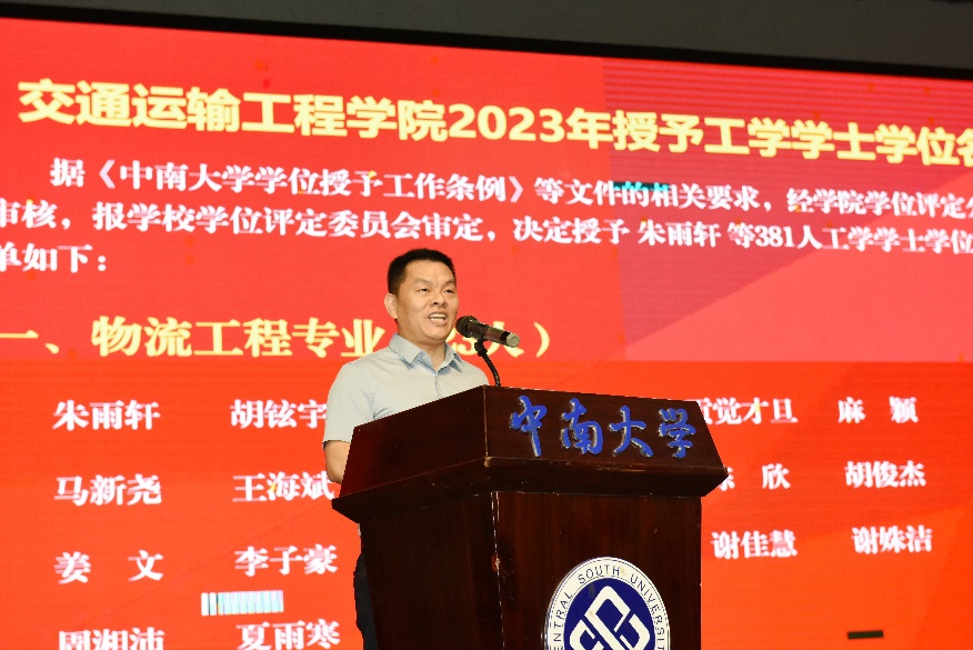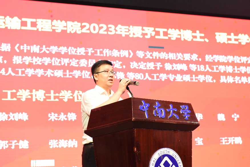 副院长彭勇宣布2023年授予工学博士和硕士学位名单,副院长陈维亚宣布学士学位学生名单。在本届毕业生中,18人获工学博士学位、44人获学术硕士学位、85人获专业硕士学位、381人获工学学士学位。