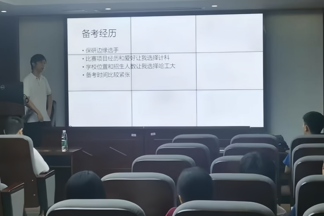 魏海龙同学以自身考研经历为主线,总结分享了在考研过程中各科所使用的备考资料以及备考时间线,叮嘱同学们要全面细致地了解所报考院校的初复试的政策及报考专业的专业核心课程,同时必须重视复试,把握好1月到3月这段黄金期充实、提升自己。