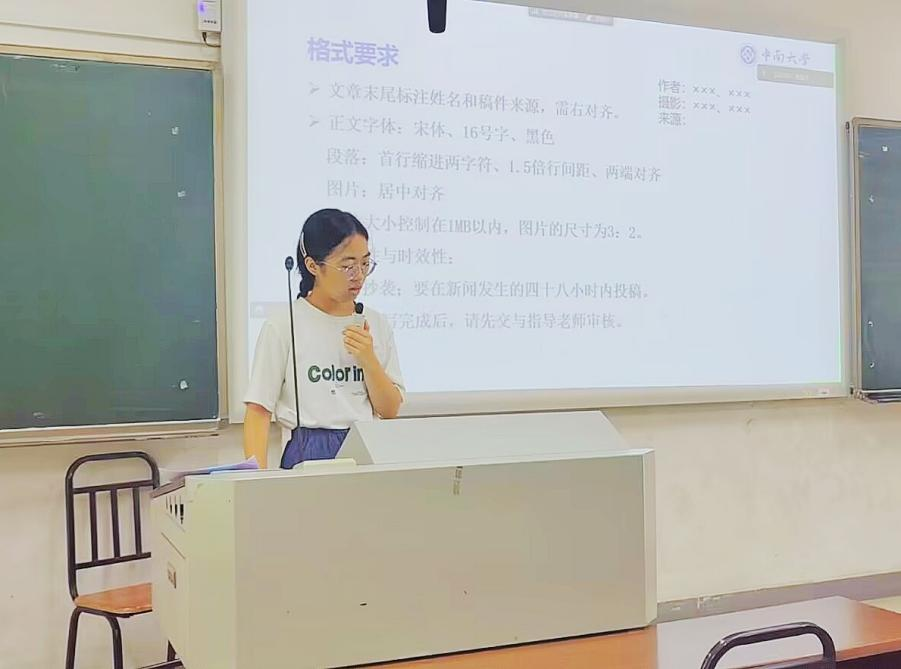 之后,陈怡莹同学分别从投稿流程、投稿注意事项、投稿方式三方面介绍投稿的注意事项。她强调,新闻宣传稿中的图片应力求表现力强、清晰度高,尽可能展示团队风貌、实践内容等。