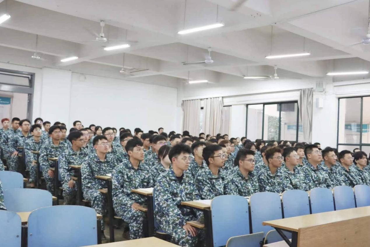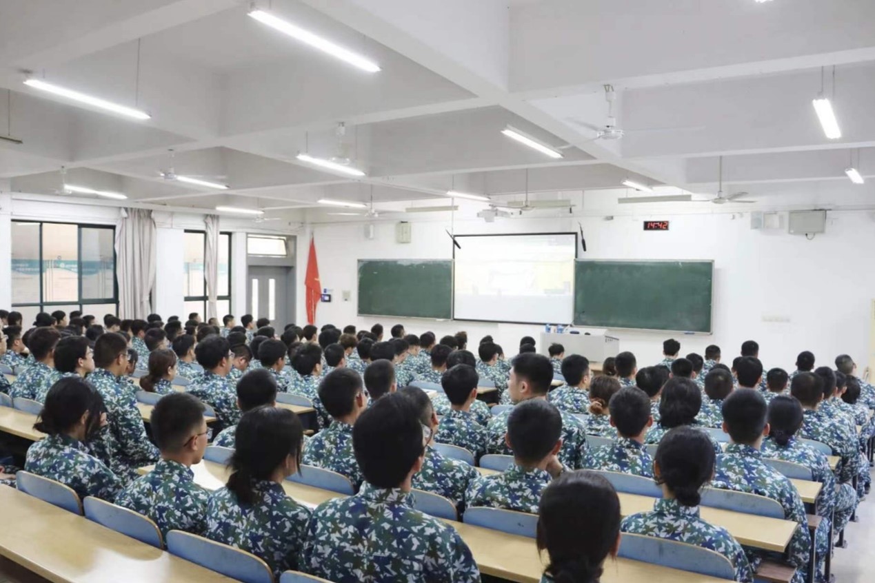 新生们在新校区体育场上大展手脚,在阳光下酣畅淋漓,跟随教官的指令,将每一个动作做到尽善尽美,强健有力。下午,新生在各营指挥下准时到达新校区B座教学楼指定教室,参与此次军训思政课程教育。本次思政课采取线下讲座与线上直播相结合的形式开展。