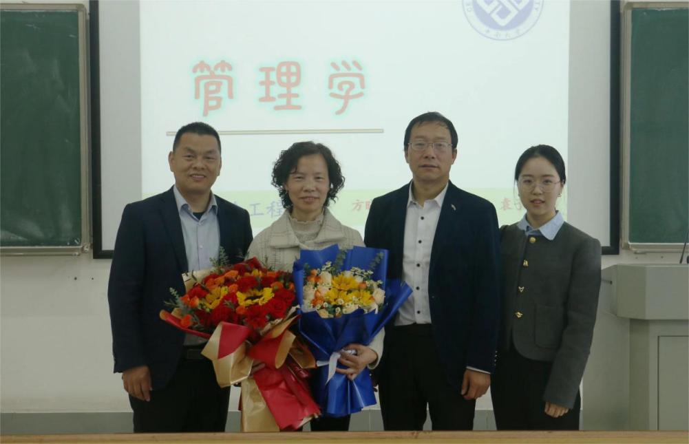 为方晓平教授献上鲜花,感谢其数十年如一日为教育教学事业辛勤耕耘,带领“管理学”课程团队积极建设课程,始终贡献有温度的课堂,并对方晓平教授致以美好地祝愿。