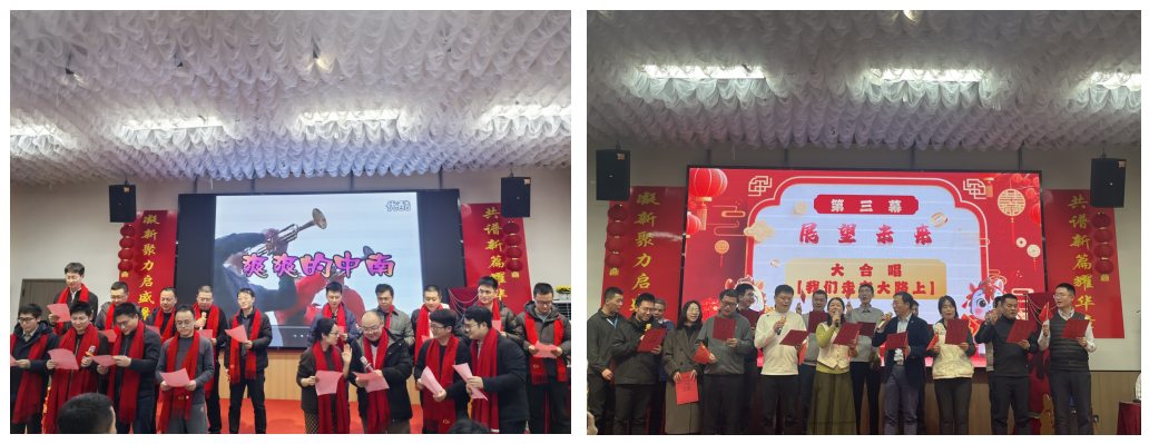 开场舞《“E”点“新”意》以唐风雅韵融合现代节奏,瞬间点燃现场气氛。随后,各系所教师纷纷登台献艺:交通设备与控制工程系与实验教学中心带来的合唱《我和我的祖国》深情款款,表达了教师们对祖国的赤子情怀;物流工程系演唱的《中国人民解放军进行曲》铿锵有力,展现了团结奋进的精神风貌;学工办创作的《健康到到令》以生动形式演绎工作与健康的平衡智慧;高速列车研究中心教师合唱的《爽爽的中南》搭配自创MV,尽显青春活力;交通运输系创作的舞台剧《运输人的时光诗》通过情景叙事,娓娓道来交通人的初心与担当;交通信息与控制工程系压轴献唱的《歌唱祖国》将晚会推向高潮,激昂歌声引发全场共鸣。