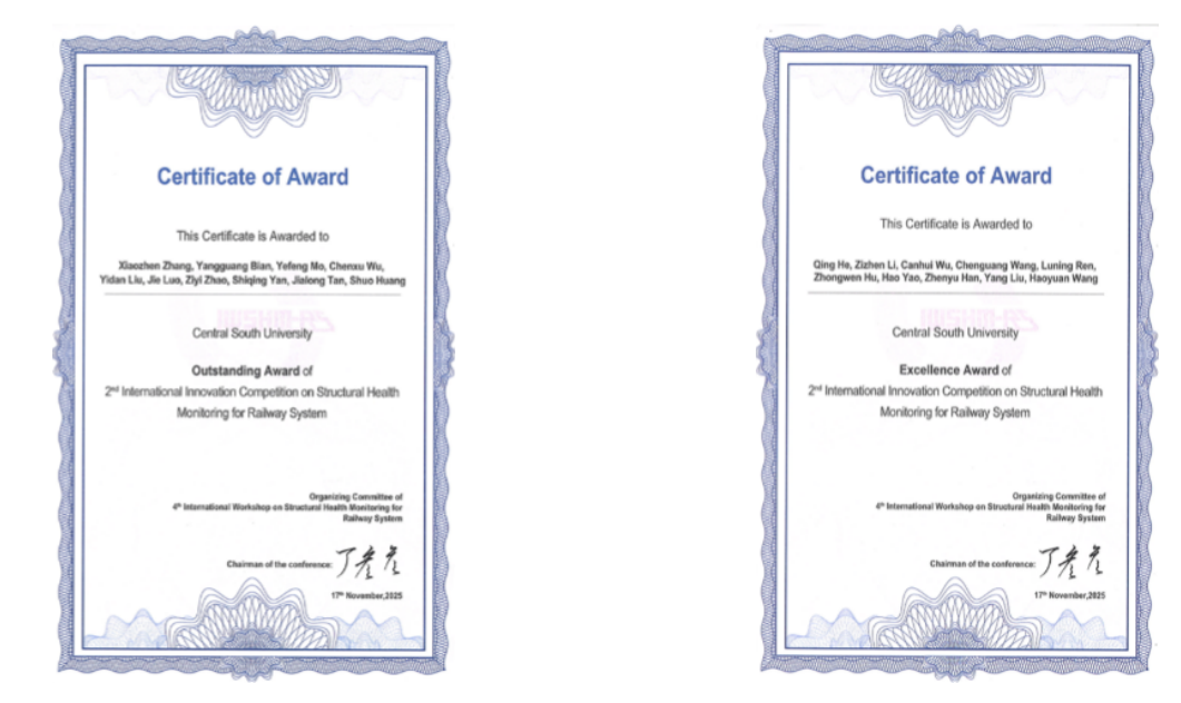 十大博彩平台 科研团队在第二届轨道交通结构健康监测国际创新大赛获杰出奖、卓越奖等多项佳绩